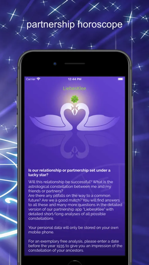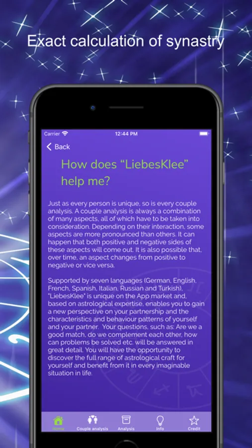 LiebesKlee aims to address these and many other questions concerning social relationships and interactions with each other. With the support of seven languages (German, English, Spanish, French, Italian, Russian, Turkish), the app offers the opportunity to discover the full range of astrological craft at reasonable prices.