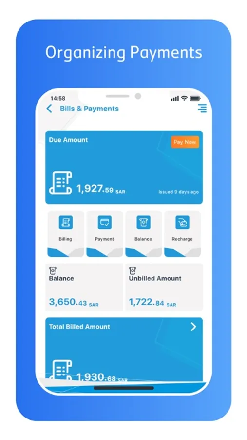 • Billing and Payments Managements (review & download your monthly invoices, manage your payments, customize your payments and recharge your services. All of this is available to pay with a Credit Card or MADA)