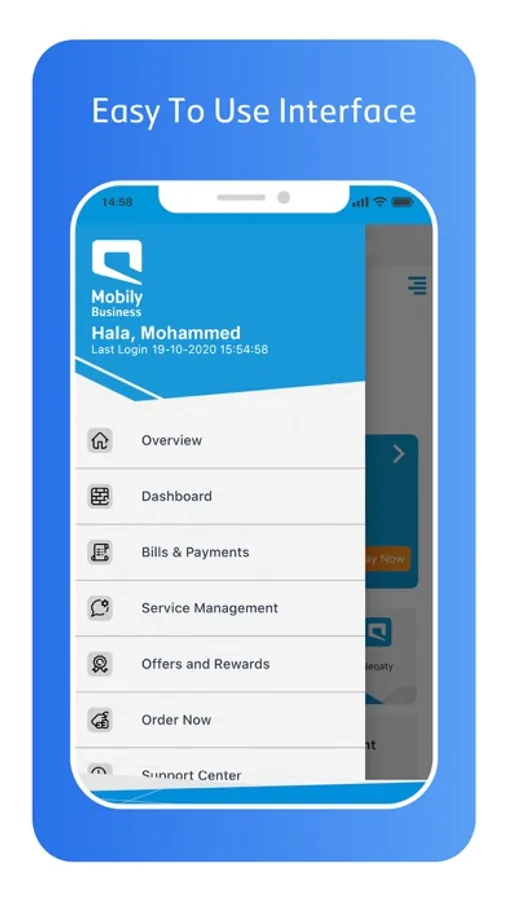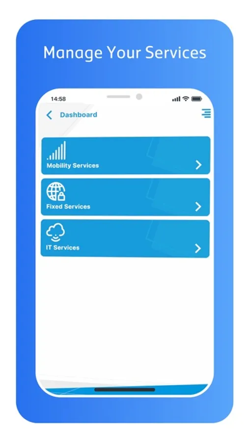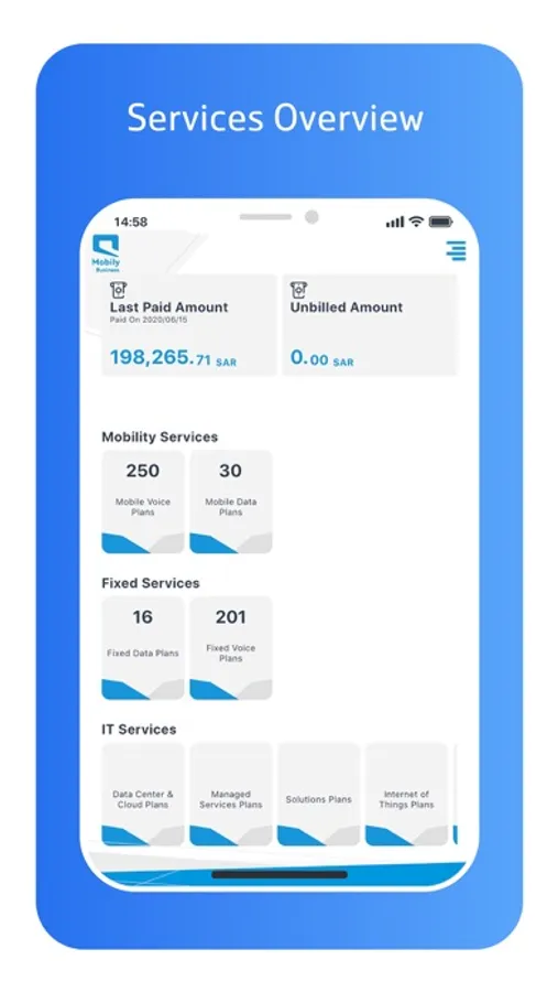 Mobily Business application provides you the ability to view your activated services through user friendly dashboards, in addition to managing your billings and payments, through: