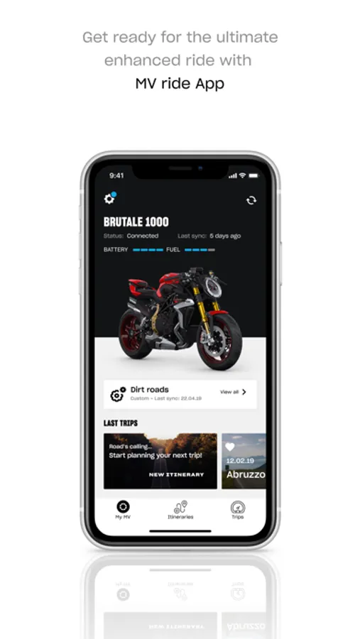 Connect your motorcycle to access three main sections: My Bike, Itinerary, Trips.