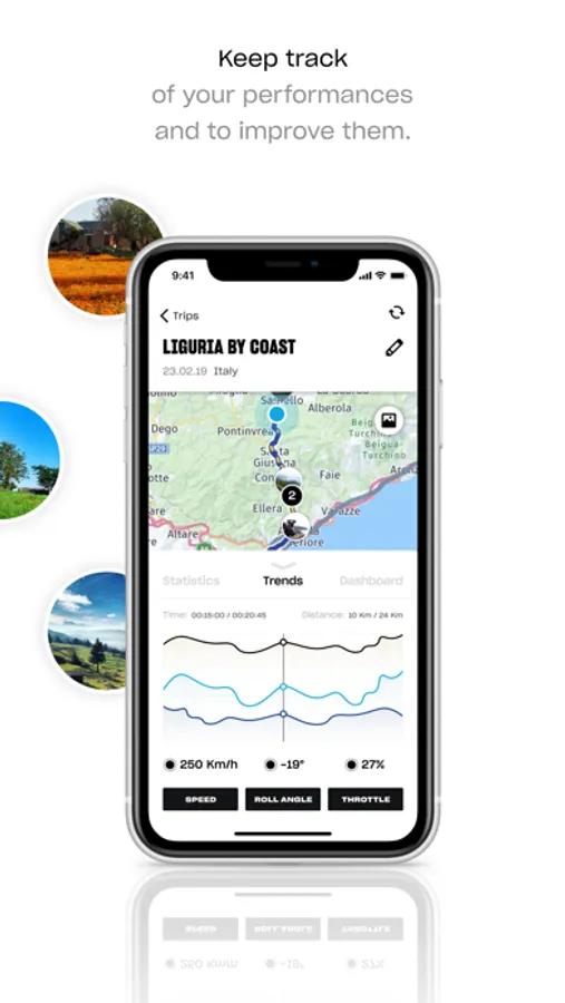 Recent trips data features speed, lean angles, gear shifts, throttle and other and other information for any moment of your trip. Pictures taken during that trip can also be added to create galleries. Always preserve a memorable experience with a wealth of technical details enriched by photographic and video contents.