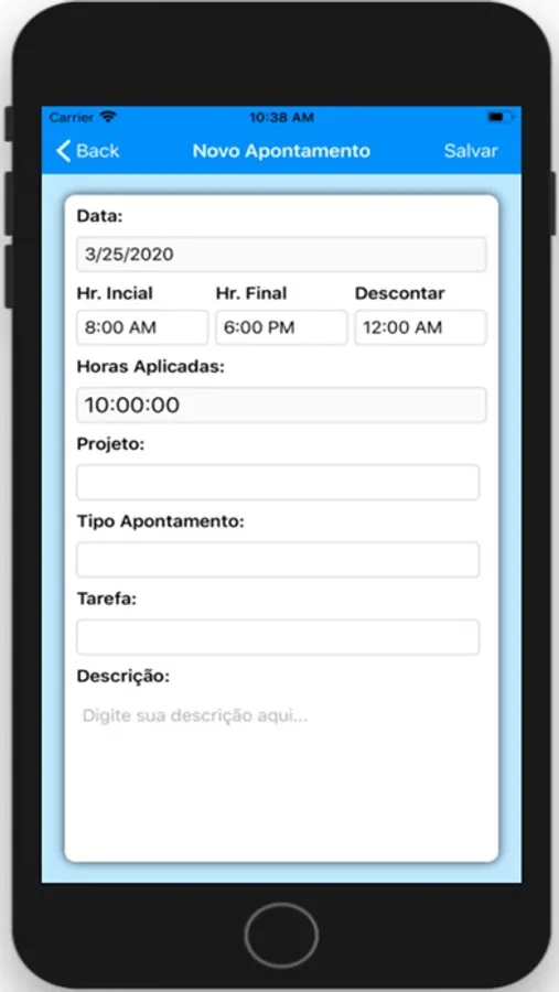 Este é um aplicativo que tem a funcionalidade de apontar horas, ou seja, que seja possível inserir as horas trabalhadas indicando como foi utilizada a hora. Colocando como parâmetro o Projeto, Tarefa, Tipo de Apontamento, quantidade de horas por projeto...