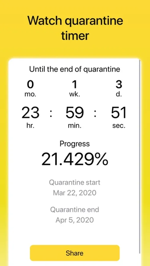 Just set the quarantine start date, select the period of your quarantine and get your personal timer.