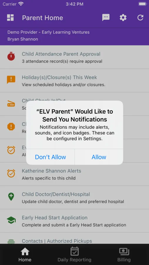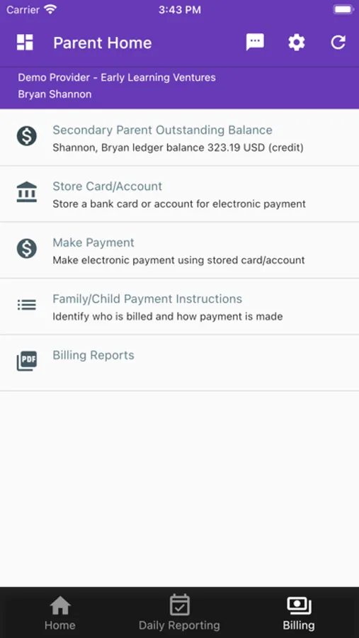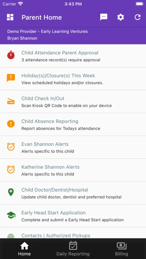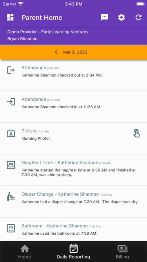 - Receive Daily Reporting events from the child care provider (ex: Diaper Changed, Nap taken, etc.)