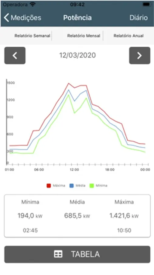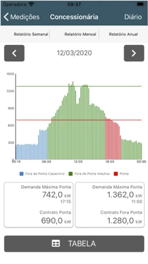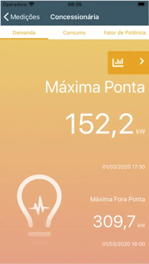 Gráficos e tabelas de demanda, consumo e fator de potência.