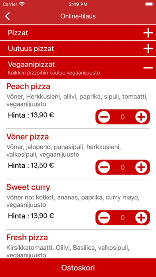 Tilaa pizzat ja kebabit noutona tai kotiinkuljetettuna. Tarjontaamme kuuluvat pizzat, Uutuus pizzat, Vegaanipizzat, Kebabit, Kanaruoat, Vöner, Vöner® Not kot kot™, Leikkeet, Pihvit, Burgerit, Lasten annokset, Kalaruoka ja Salaatit.