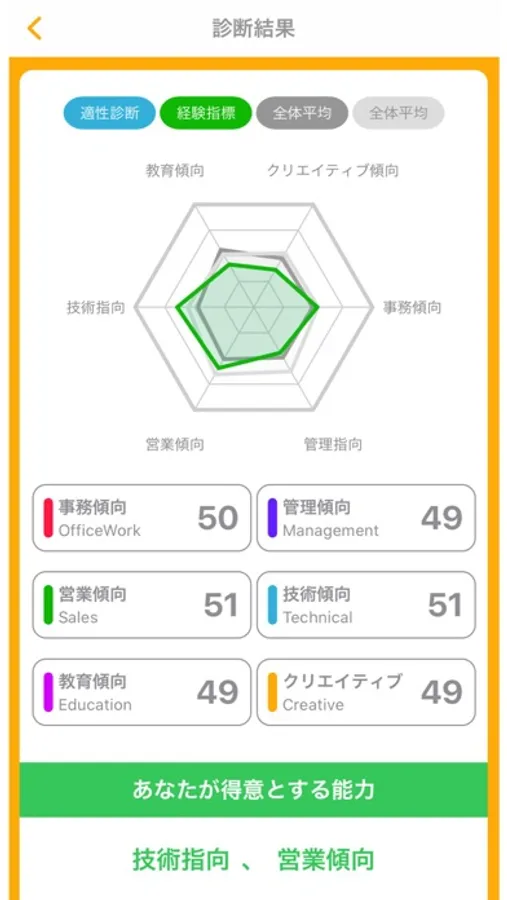 事務タイプ・管理タイプ・営業タイプ・技術タイプ・教育タイプ・クリエイティブタイプの大まかな6つの適職タイプを設定。