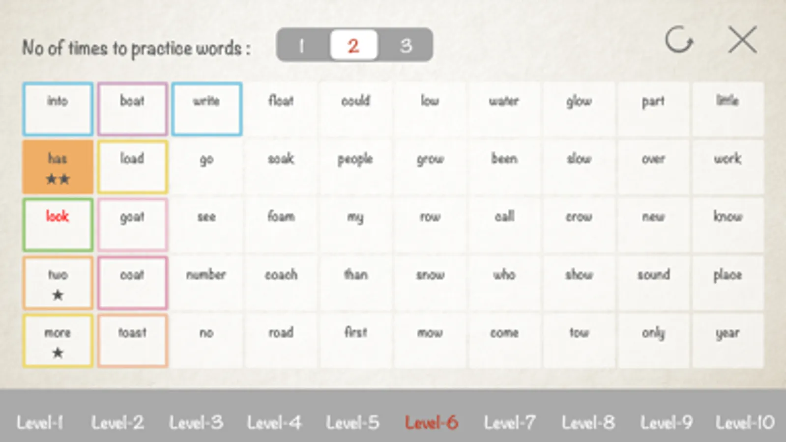 The words are organized in 10 levels, each level containing 50 words. Each level has a mix of phonics/regular + sight/irregular words. You have a complete flexibility to select as many or as little words as you would like to focus on at any time.