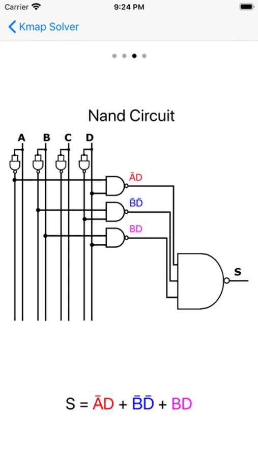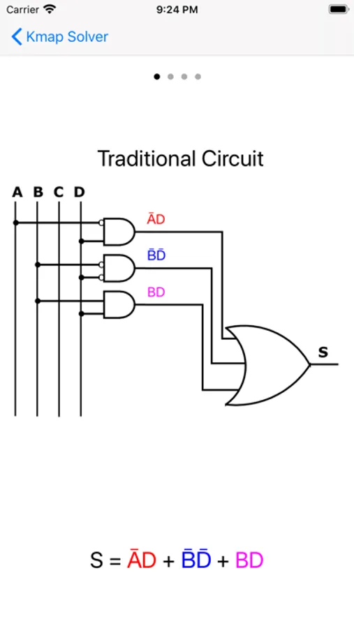 This application solves Karnaugh Map, also called Kmap, for 2, 3, 4 or 5 variables. It is the only application I know that will provide (and show on Kmap) ALL possible kmap solutions. It will also shows four different versions of an optimized output logic circuit: a tradicional version, a circuit with common inverters and NAND/NOR only circuit.