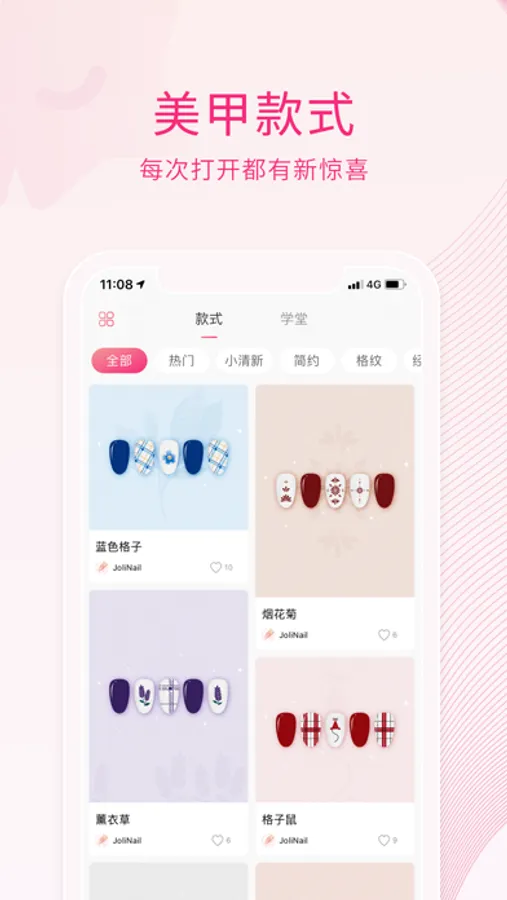 JoliNail 专注于彩绘美甲款式,逾百款原创美甲款式与图案设计供挑选,也支持DIY创作属于自己的美甲款式。