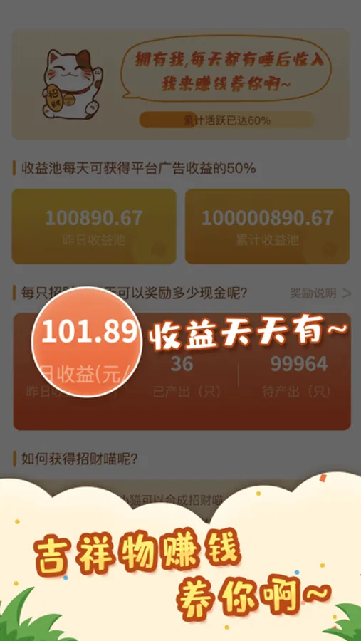 4.【招财喵】合成38级招财喵每天从平台收益池中分得现金,单日最高200元,小猫赚钱养你啊~