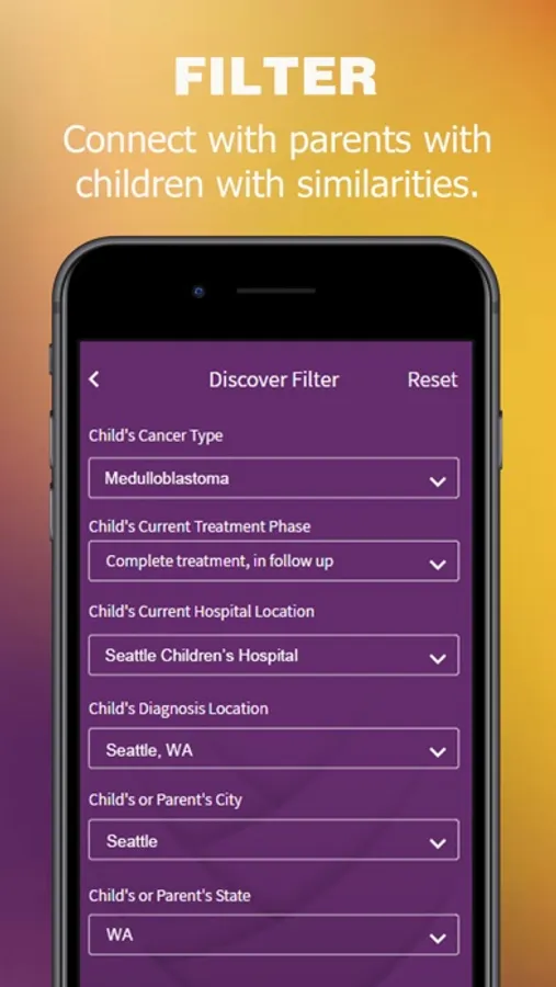 *Conduct specific filter searches which include the following search criteria: cancer diagnosis, child's current treatment phase, child's or parent's city, child's current hospital location, child's diagnosis location, age, sex assigned at birth, and/or gender