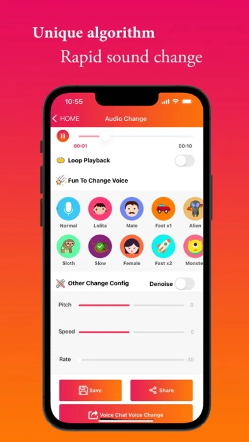 - Support the change of sound pitch +tempo + rate and easily save your favorite sound change works.