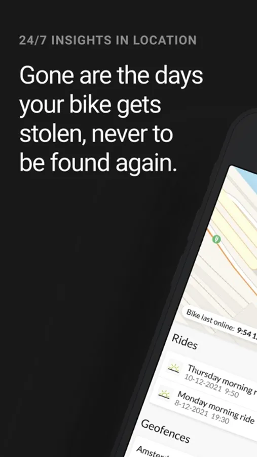 Our app grants you a near real-time 24/7 insight in your bike’s current location and whereabouts, even if it’s not you riding the bike. The GPS is installed inside your bike and gives you peace of mind wherever your bike takes you.
