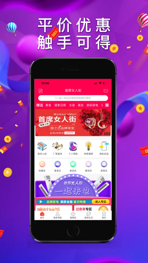 轻奢馆、服饰馆、美妆馆、美食馆及家居馆汇集优质好货,体验购物的快感,增添生活的品位。