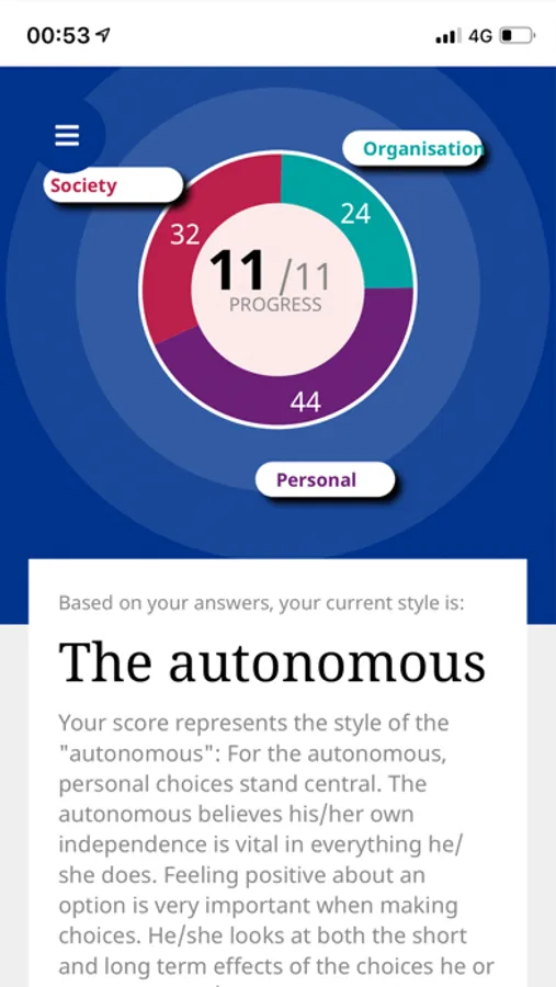 3. Users choose one of the four answers to the dilemma. They can then compare their responses to those of other users and discuss it with colleagues in the comment section. Users can also receive a score and feedback on their choices, for example, in one of six profiles that is composed based on their responses to several dilemmas.