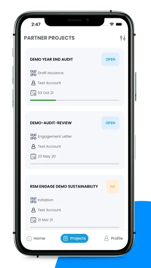 RSM Kuwait Engage is an application that allows RSM clients to engage in the process of auditing through a step by step approach. Clients will be able to view the updates on the progress of all their active projects, making it easier for them to see the current stage and status of each activity with the due date. Client can view the List of Requirements for an activity if any and its status (Received/ Not Received).