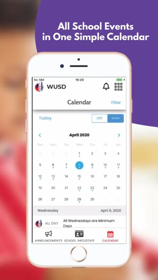 The app includes information for the district and all schools. Filter by the school your child attends to feature information for that school.