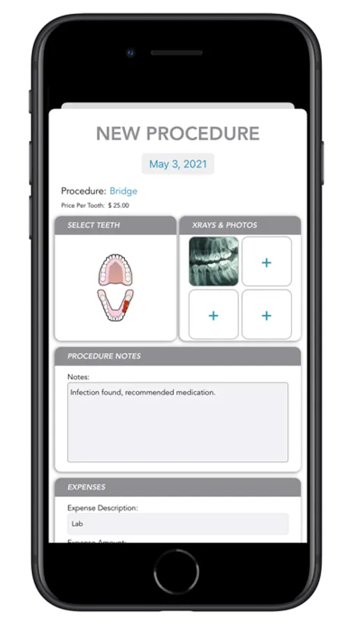5. Treatment Plan: Take notes during a consultation. Provide the patient with an estimate price. When done, just swipe to add it to procedures.