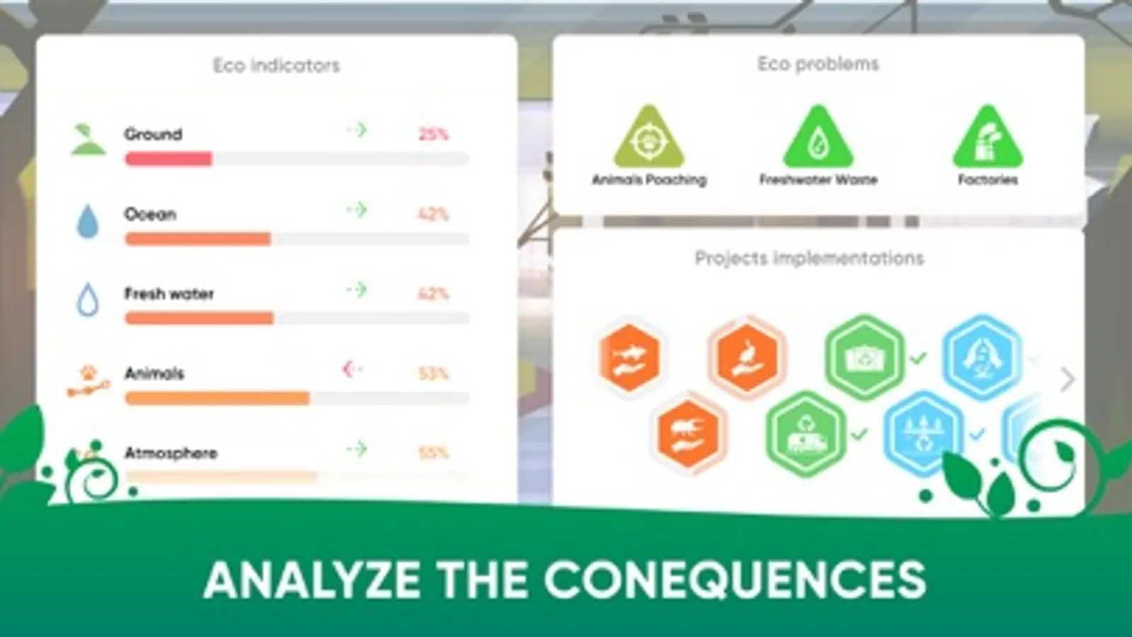 The player’s goal is to stabilize ecological situation on the whole planet on early stages. And then step by step restore and improve eco-situation of the Earth. In the end of your game you will get your statistics on how successful your mission was. Each step leads to different consequences, you have to make thoughtful actions and fast.