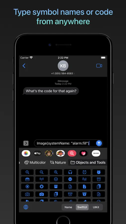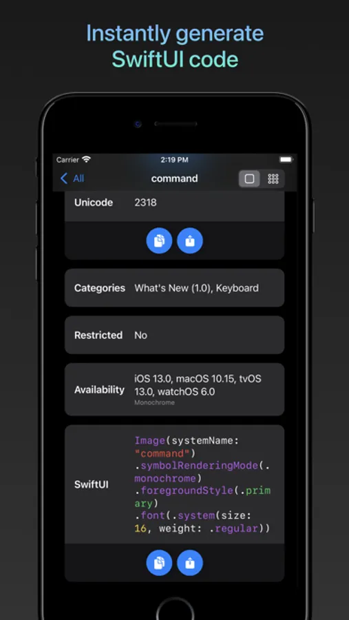 Automatically generate SwiftUI and UIKit code for every symbol and weight. Drag and drop support means you can drop the code right into other apps (such as Swift Playgrounds) on iPad.