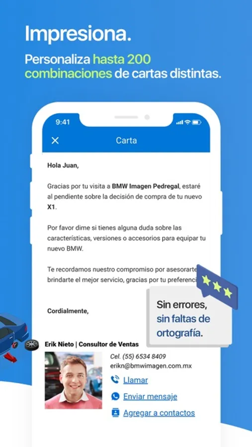 Impresiona a tus clientes con cartas personalizables, sin errores de ortografía y con una redacción impecable. Le ofrecerá a tus clientes una experiencia de usuario única gracias al seguimiento que recibirá al poco tiempo de haber visitado tu agencia.
