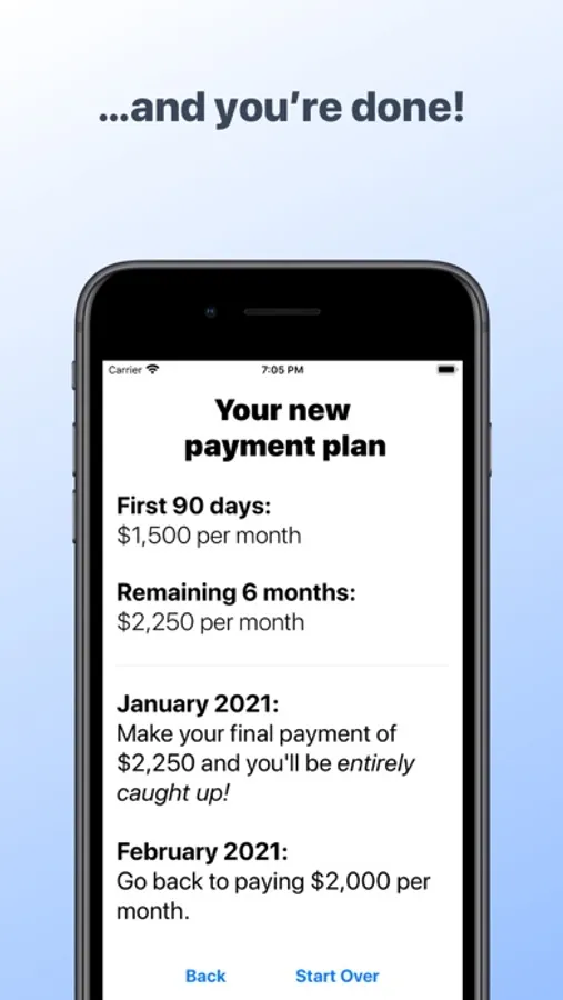 The Defer My Pay app effortlessly guides you through 3 simple questions (while _never_ asking for, or collecting, personally identifiable information) and then instantly presents you with a customized deferred payment plan that works for both the debtor and the creditor (i.e. the one paying and the one collecting). You can even move back and forth through the questions and adjust as needed. This allows the people on both sides of the transaction get to keep the roof over their heads and food on their tables. It's a win-win.