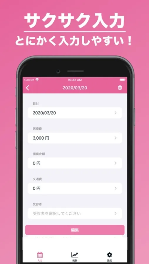医療費以外にも、補填される金額や交通費、メモも入力できるので、医療費控除の申請の際にも使えるので、どんどん入力してください!