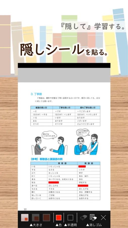 【隠しシール】ブック内に隠しシールを貼付し、タップで表示/非表示を切り替えることができます。