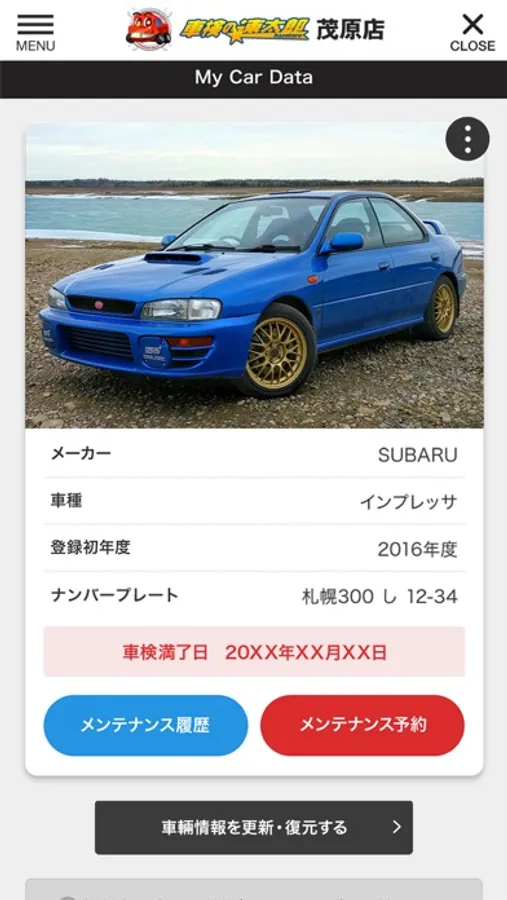 一度店舗へご来店いただきお車の登録がある場合、アプリに必要情報を入力していただくと、ご自身のお車の車検時期などがアプリ上でご確認いただけます!