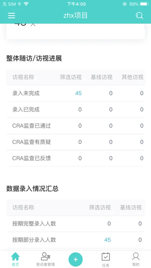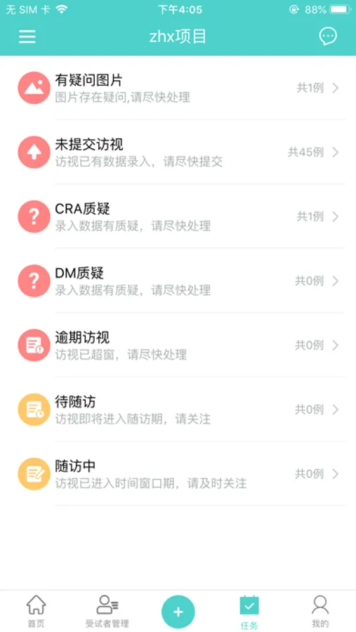 首页可根据项目切换您所参与的研究项目,并查看患者有疑问的访视数。