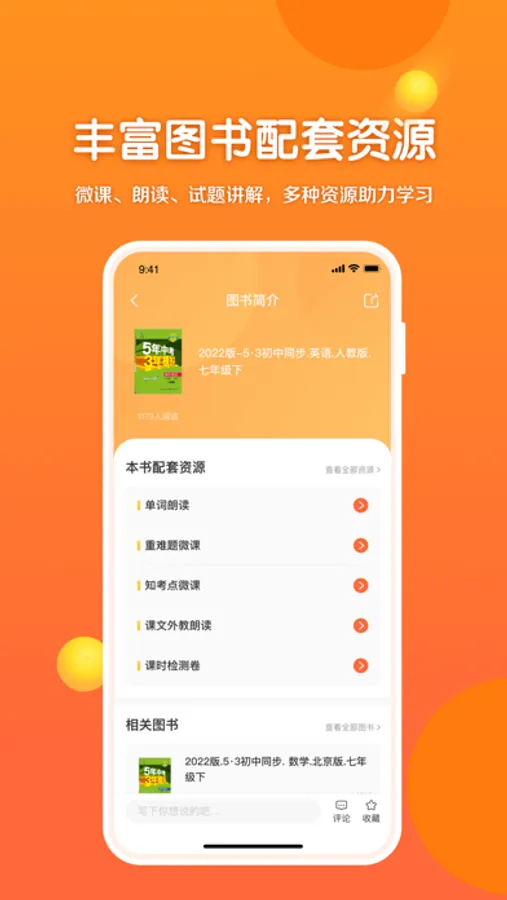 【53图书】丰富图书配套资源,学生可以通过53伴学APP进行听力练习,课文跟读,查看微课视频、习题解析视频、同步资料打印等。