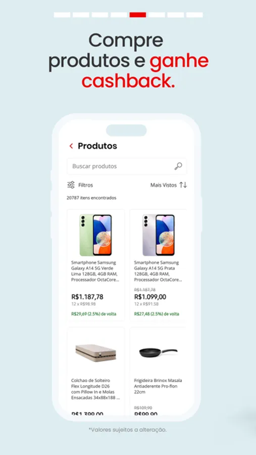 Aqui você compra produtos em dinheiro pelo app ou site e recebe parte do valor de volta. Escolha como receber seu cashback: pontos Esfera ou desconto na fatura do seu cartão Santander.