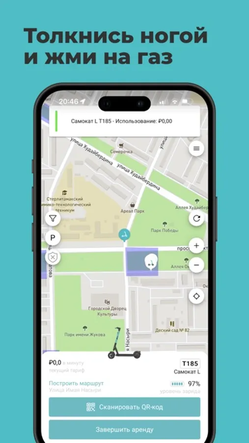 Больше не нужно ехать в определенную точку, оставлять в залог документы или деньги и подписывать бумажные договора. Все что нужно - это скачать наше приложение, пройти простую регистрацию, найти самокат на карте и начать свою первую поездку!