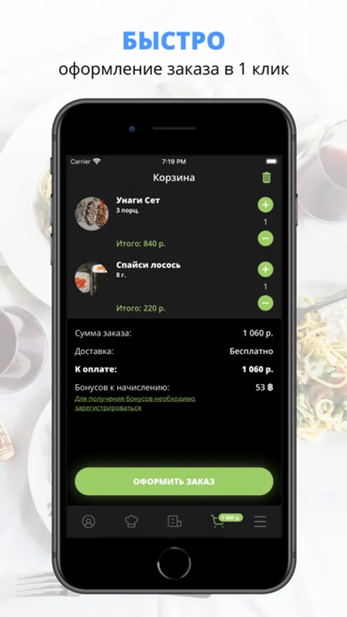 Скачивайте наше приложение, оформляйте заказ и наслаждайтесь любимой едой, где бы Вы ни были! Приятного аппетита!