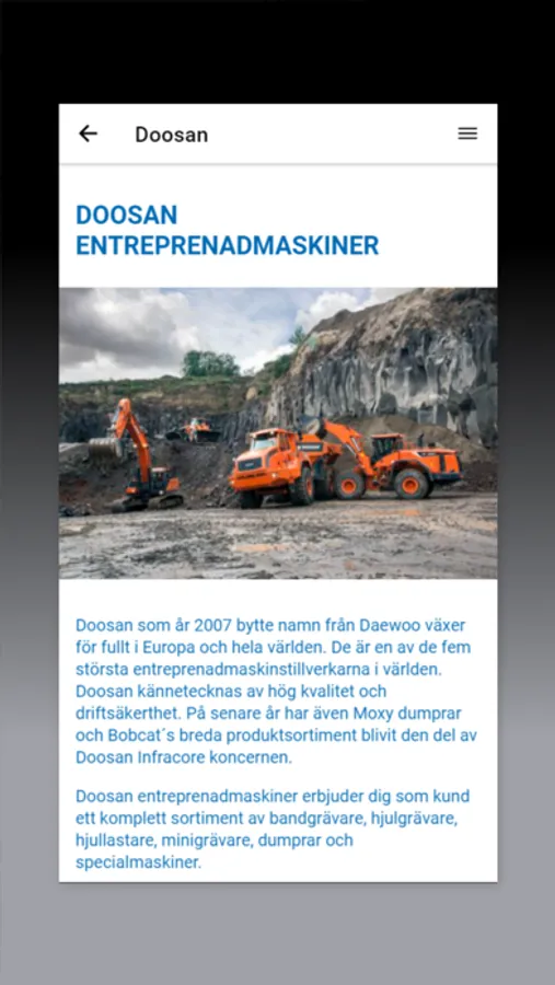 Här kan du få information om våra maskiner från våra märken Doosan, Case och Bergmann. Se vårt lager av begagnade maskiner. Hitta närmaste serviceverkstad eller gör en serviceförfrågan direkt till vår eftermarknadsavdelning. Här finner du även information om Maskinia och dess bakgrund samt kontaktinformation till vår personal.