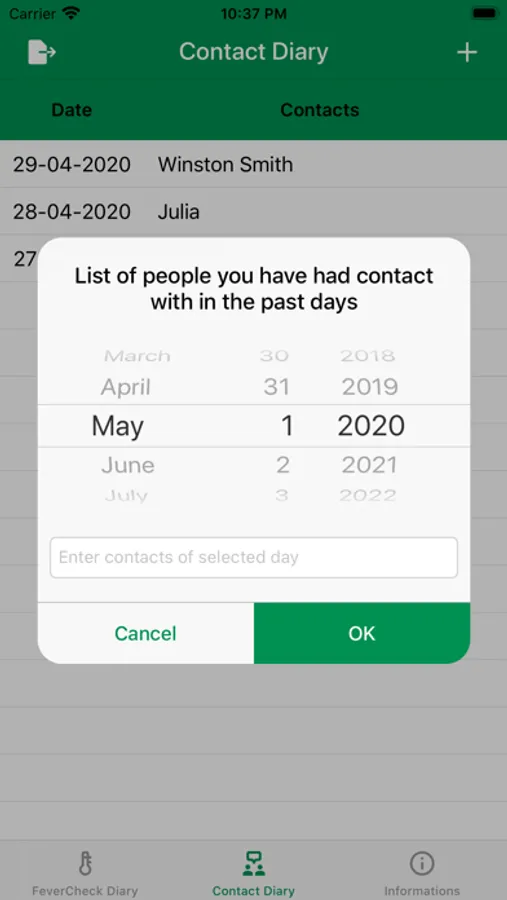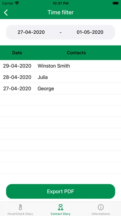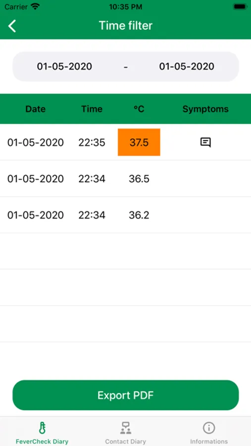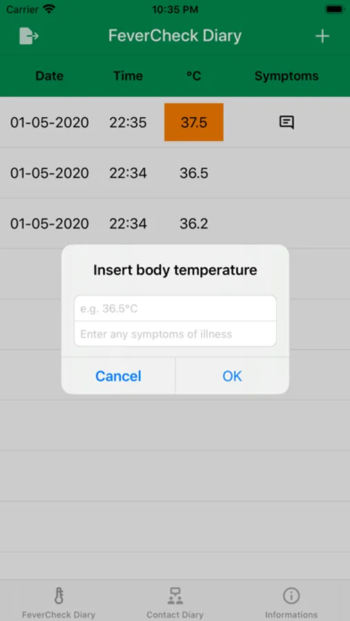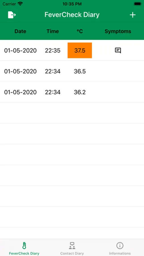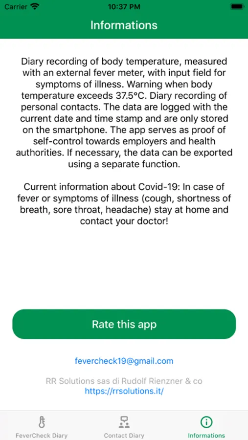 Diary recording of body temperature, measured with an external fever meter, with input field for symptoms of illness. Warning when body temperature exceeds 37.5°C. Diary recording of personal contacts. The data are logged with the current date and time stamp and are only stored on the smartphone. The app serves as proof of self-control towards employers and health authorities. If necessary, the data can be exported using a separate function.