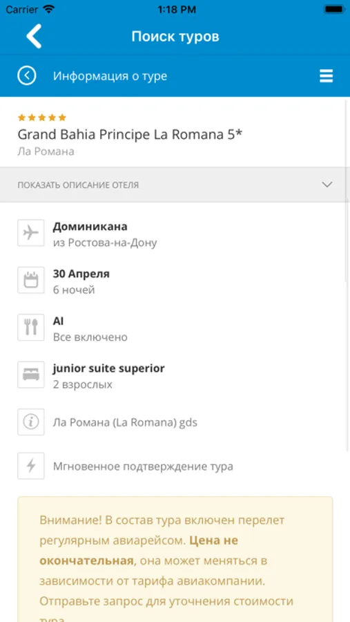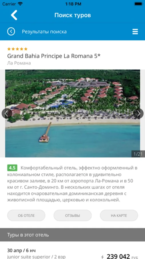 Найти хороший вариант отдыха с нашей помощью может любой желающий. Приложение работает 24 часа в сутки, предоставляя подробную информацию об отелях, включенных в стоимость путевки услугах, перелете и о многом другом.