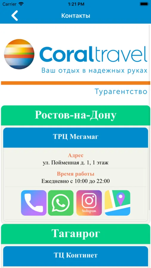 Информация: Приложение «Coral Travel Турагентство Ростов-на-Дону» представлено уполномоченным турагентством CORAL Travel, ООО «Ретейл» в режиме онлайн. ИНН 6154150303, ОГРН 1176196051228, Местонахождение: 344002 г.Ростов-на-Дону ул.Пойменная д.1 , Юр Адрес: Юридический адрес: 347917, Ростовская обл., г.Таганрог, ул. Александровская д.117, офис 2, ул. Тел. +7 (863) 279-56-39. Показывает актуальные цены ведущих туроператоров в режиме онлайн. Данное приложение является официальным приложением турагентства Coral travel ООО «Ретейл» (poisk-travel.com), но не является официальным приложением туроператора Coral Travel (coral.ru)