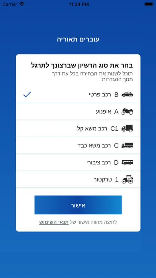 לאחר שתבחרו את סוג הרשיון עליו תרצו להיבחן, נבנה לכם את מאגר השאלות המתאים כך שתראו רק את השאלות הרלוונטיות לסוג הרשיון שבחרתם.
