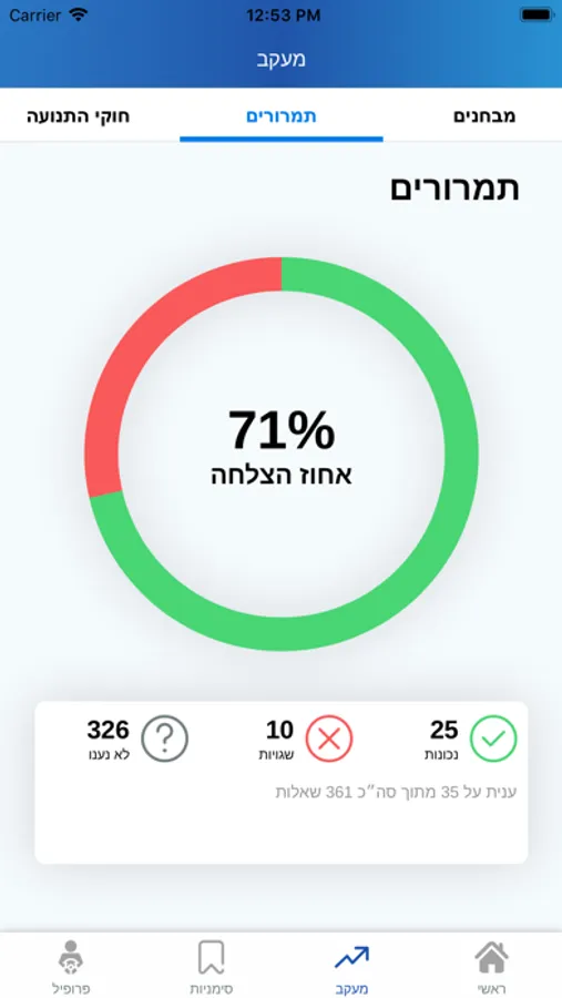 ענית על פחות? לא נורא. אנחנו מאפשרים לכם לעשות אינסוף של מבחנים. תוכלו לראות את קצב ההתקדמות שלכם בעמוד המעקב.