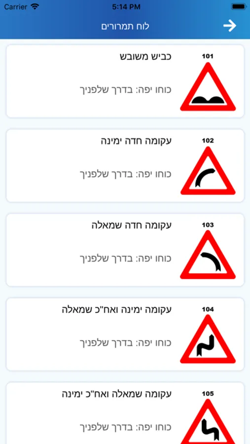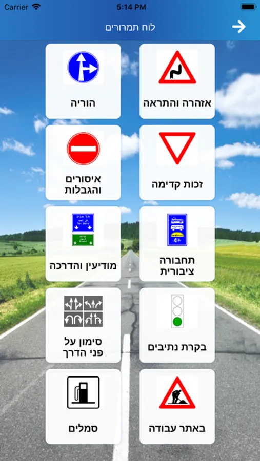 לוח התמרורים הרשמי של משרד התחבורה. לצד כל תמרור יופיע הסבר מלא. אנו ממליצים לעבור על הלוח במלואו, לשנן אותו ולתרגל את שאלות התמרורים מספר פעמים.