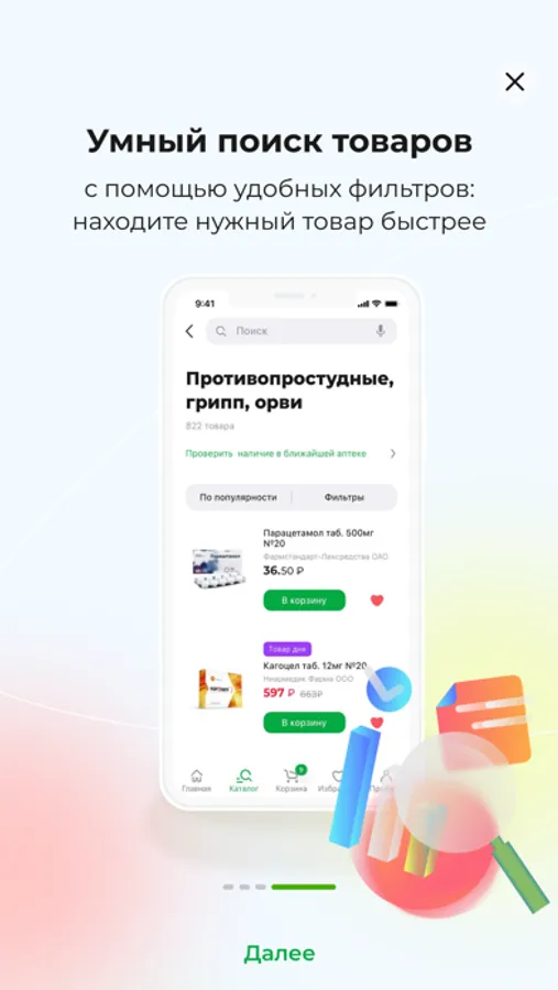 Умный и голосовой поиск, позволяют быстро найти нужные препараты в каталоге. Кроме того, Вы можете быстро найти лекарства по симптомам.
