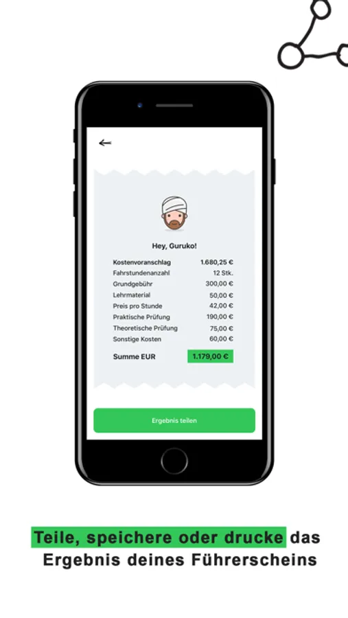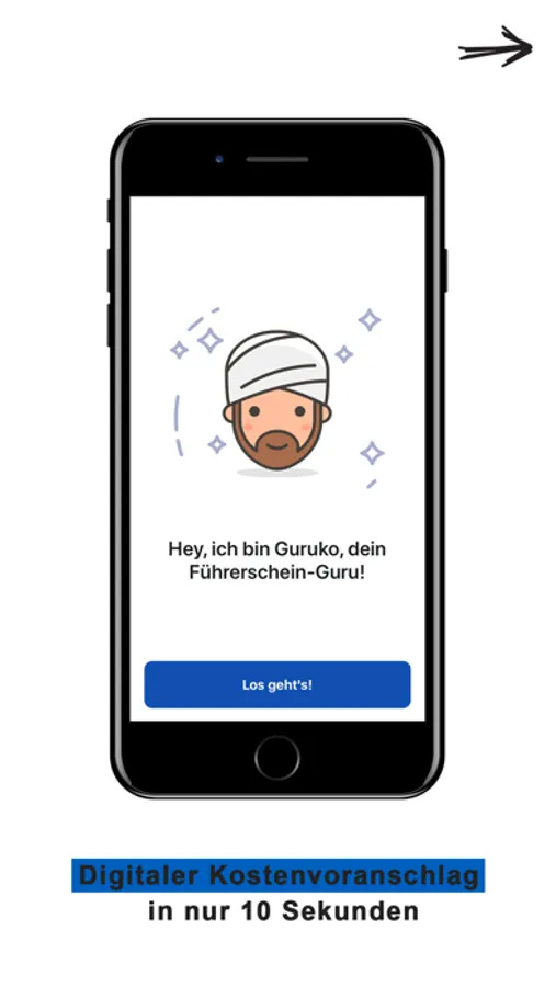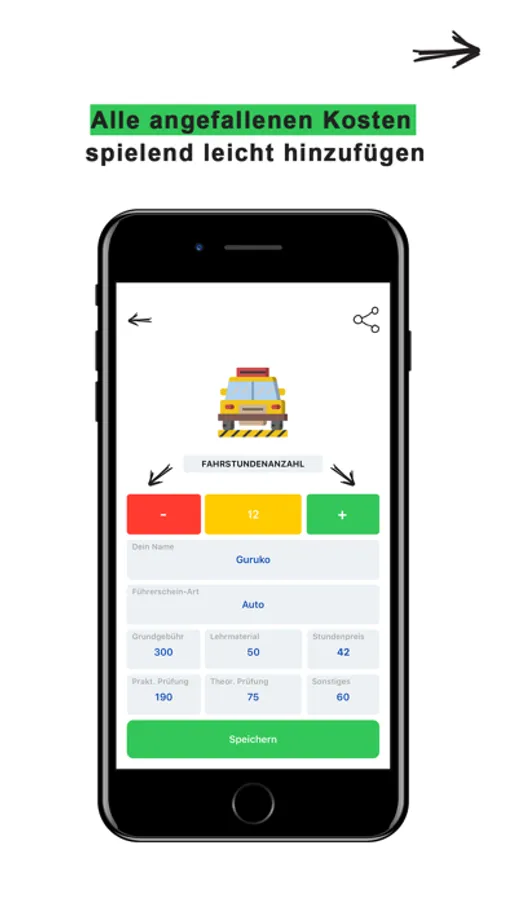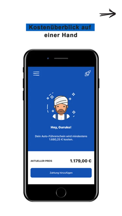 Guruko, Dein persönlicher Führerschein-Guru, erstellt dir beim ersten Start der App einen digitalen Kostenvoranschlag und teilt dir direkt mit, wie viel Geld du für deinen Führerschein mindestens einplanen solltest. Du erhältst deinen Kostenvoranschlag binnen 10 Sekunden. Du musst lediglich 3 einfache Fragen beantworten. Anschließend kannst du gleich loslegen. Per "Zahlung hinzufügen"-Button fügst du spielend leicht deine - in der Fahrschule angefallenen Kosten - hinzu. Und per Klick auf den "Raketen"-Button, kannst du ebenfalls kinderleicht alle deine absolvierten Fahrstunden hinzufügen, sodass du nie wieder den Überblick
