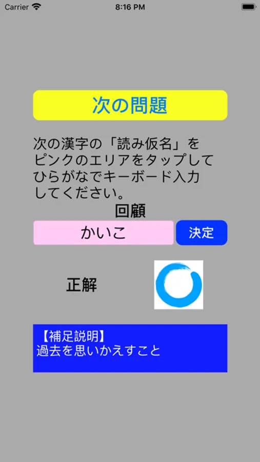 4)”正解”すると「補足説明」の欄に、漢字の意味が表示されます。