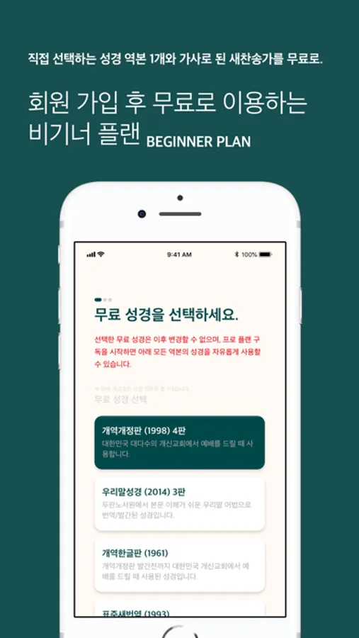 - 사용자 본인이 직접 선택한 성경 역본 1개 평생 무료.