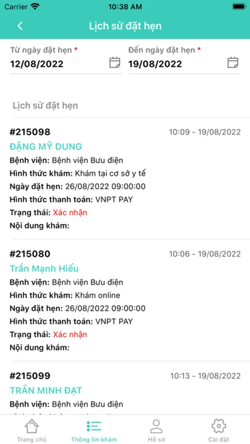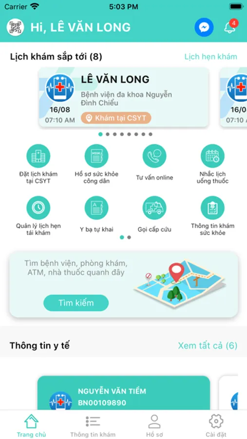 - Thông tin khám chữa bệnh: Các lịch sử các lần khám qua ứng dụng, các kết quả kết luận của bác sĩ