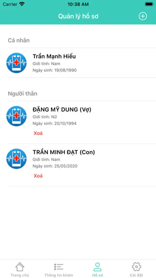 - Thông tin cá nhân và người thân: thông tin hành chính, thông tin thẻ Bảo hiểm Y tế, thông tin quan hệ gia đình và thông tin liên hệ