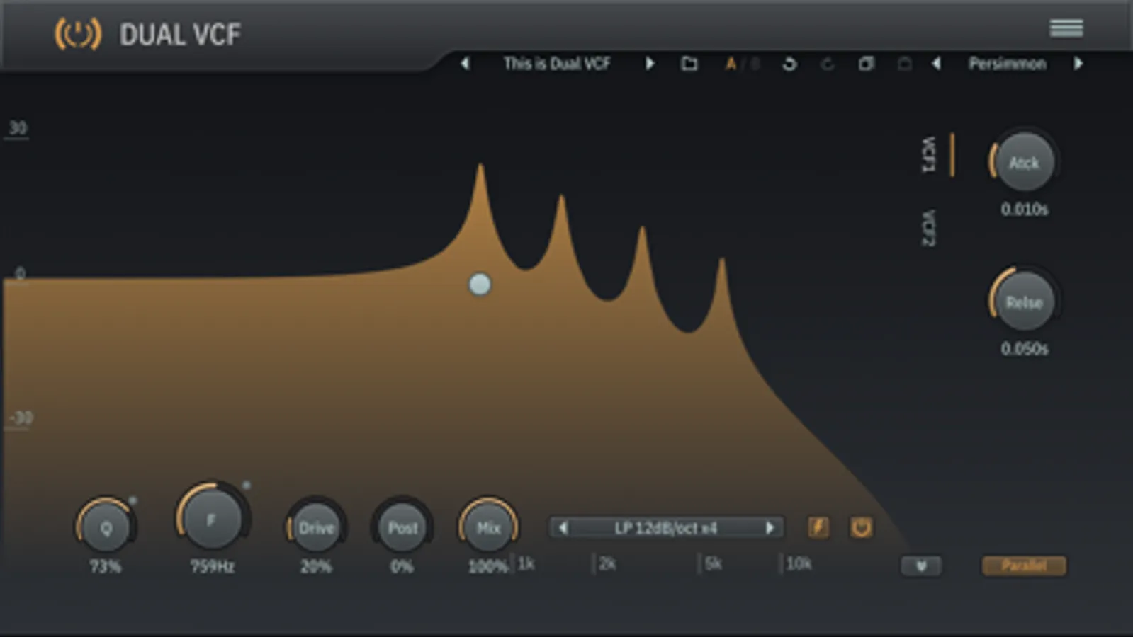 Dual VCF features two filter sections, each supporting dozens of low-pass, high-pass and band-pass filter types. Every type is painstakenly modeled after analog filter types found in analog gear, analog synthesizers, and alike, including non-linear filter behavior. Dial in that characterstic 70s, 80s or 90s filter to add some analog flavor to your tracks!