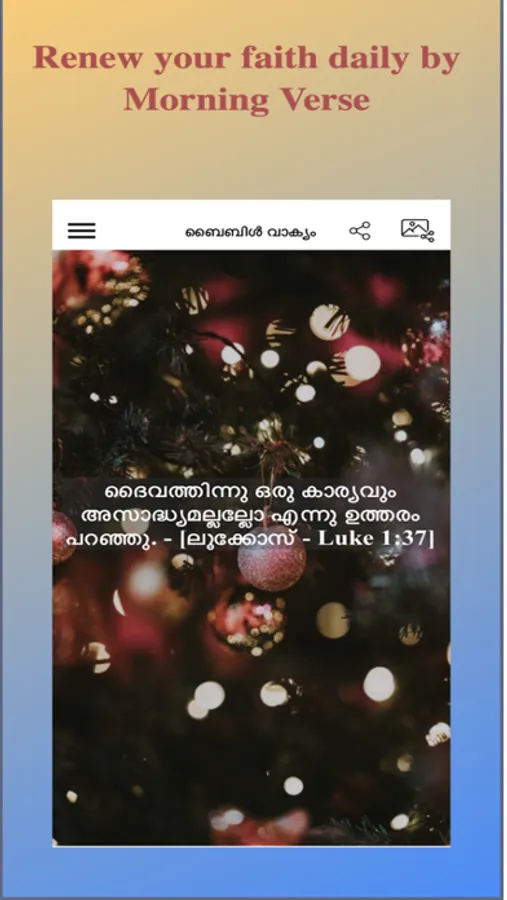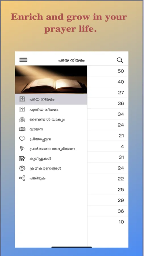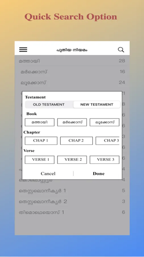 As a praise to the Lord, we are happy to bring this offline Malayalam Holy Bible app for iPhone & iPad devices. The app works in offline mode, it contains complete 'Old Testament' and 'New Testament' in Malayalam. The app displays 'Bible verse' by notification in Malayalam on a daily basis .